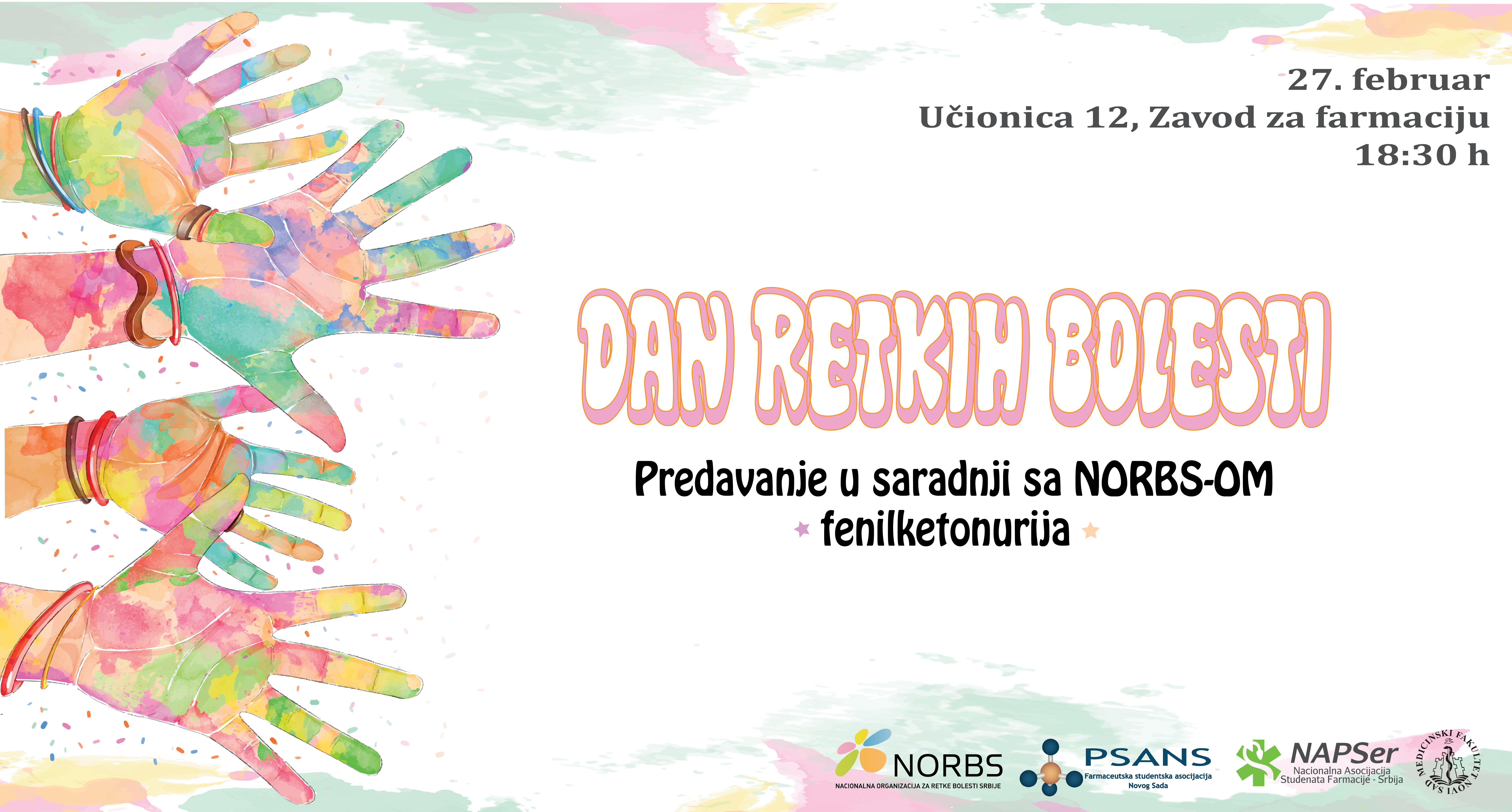 Povodom Međunarodnog dana retkih bolesti PSANS u saradnji sa NORBS-om organizuje predavanje na temu „Fenilketonurija“. Predavanje će se održati 27.02. u učionici 12 na Zavodu za farmaciju, sa početkom u 18:30h.