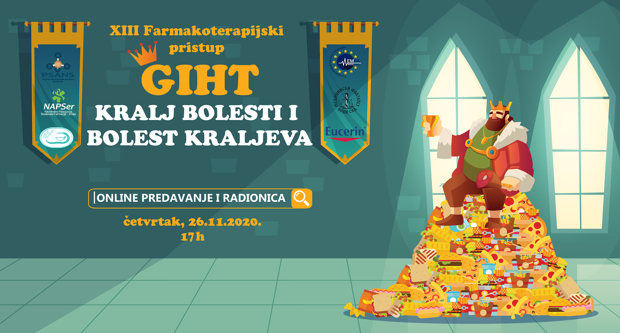 Farmaceutska studentska asocijacija Novog Sada - PSANS (Pharmacetuical Students’ Association of Novi Sad), će 26. novembra u 17 časova organizovati 13. Farmakoterapijski pristup pod nazivom „Giht – Kralj bolesti i bolest kraljeva“, u saradnji sa Evropskom asocijacijom studenata medicine – EMSA sa Medicinskog fakulteta u Novom Sadu. U skladu sa trenutnom epidemiološkom situacijom, odlučili smo da predavanje i radionicu održimo online, putem Go To Meeting platforme.