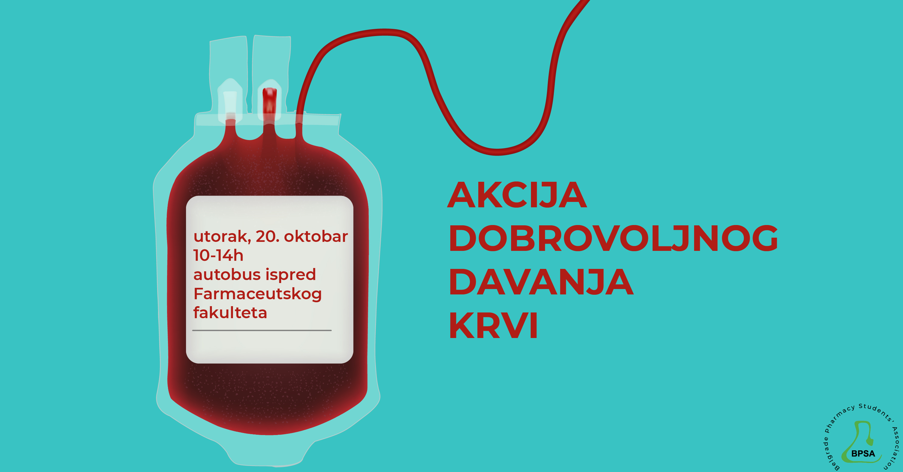 Akcije će se održati 20. oktobra (utorak) od 10 do 14 časova u transfuziomobilu ispred Farmaceutskog fakulteta. Krvi mogu dati osobe ženskog pola ukoliko je od poslednjeg davanja krvi prošlo 4 meseca i osobe muškog pola ukoliko je od poslednjeg davanja krvi prošlo 3 meseca.