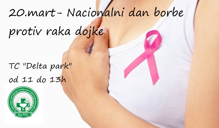Asocijacija studenata farmacije u Kragujevcu- KgPSA u saradnji sa Institutom za javno zdravlje Kragujevac obelezava Nacionalni dan borbe protiv raka dojke 20. Marta 2017. godine u TC “Delta Park”, u periodu od 11 do 13h. Dodjite da saznate nesto vise o prevenciji i znacaju ranog otkrivanja raka dojke!