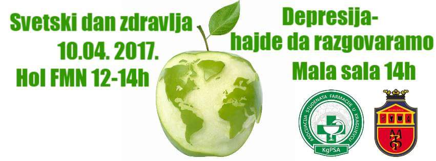 Asocijacija studenata farmacije u Kragujevcu (KgPSA) će, uz podršku Instituta za javno zdravlje Kragujevac i Apotekarske ustanove, organizovati akciju povodom Svetskog dana zdravlja. Akcija će biti održana 10.aprila, u holu Fakulteta medicicnskih nauka u Kragujevcu, od 12 do 14h. Zatim će, u Maloj Sali, od 14h, biti održana tribina ''Depresija- hajde da razgovaramo'', gde će dr Milica Borovčanin i dr Branimir Radmanović pokušati da Vas informišu, i nauče kako da razgovorom zajedno savladamo bezrazložnu tugu.