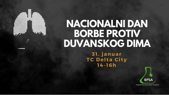 Drage kolege, želimo da vas obavestimo da će se 31. januara, 14-16h, u TC Delta City, održati akcija povodom Nacionalnog dana borbe protiv duvanskog dima. Akciju sprovodimo zajedno sa Gradskim zavodom za javno zdravlje, a pored volontera Crvenog krsta Beograd, sprovođenju akcije će doprineti i naši volonteri - Sekcije za Javno zdravlje. Predviđeno je deljenje promotivnog materijala, razgovor sa prolaznicima o štetnim efektima duvanskog dima, kao i skretanje pažnje prolaznicima na interesantne činjenice povezane sa pušenjem cigareta.