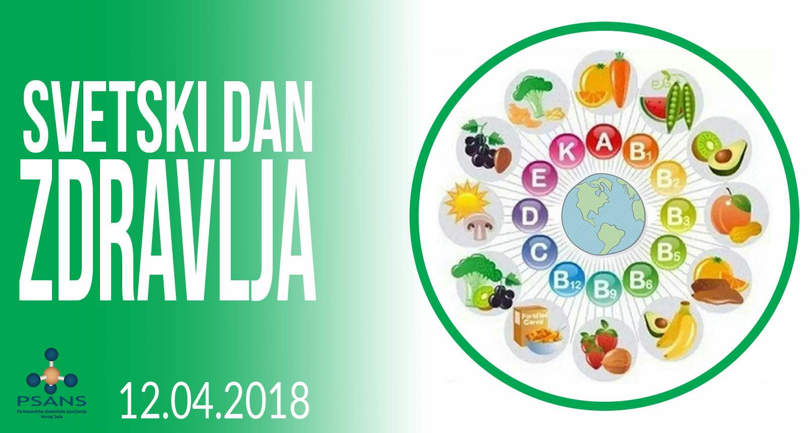 PSANS u saradnji sa Zavodom za zdravstvenu zaštitu studenata organizuje akciju povodom Svetskog dana zdravlja, koja će se održati 12.04., u periodu od 11h do 13h u studentskom kampusu. Razgovaraćemo sa studentima o značaju vitamina i minerala, o tome kako na jednostavan način možemo održavati njihov balans u organizmu, a pored toga bićemo u mogućnnosti da aparatom proverimo stanje vitaminske aktivnosti u organizmu. Svi zainteresovani mogu da se jave na mejl This email address is being protected from spambots. You need JavaScript enabled to view it. ili koordinatoru Javnog zdravlja Nataši Bućan u inbox.