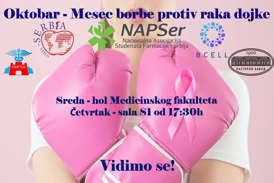 NiPSA tim vas poziva da nam se pridružite u obeležavanju Meseca borbe protiv raka dojke. Ovim povodom organizujemo dvodnevnu akciju Javnog zdravlja na Medicinskom fakultetu u Nišu, u saradnji sa Komitetom za međunarodnu saradnju studenata medicine (IFMSA – Serbia LK Niš), Institutom za javno zdravlje Niš i uz podršku B.CELL platforme.