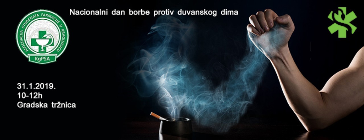 Povodom Nacionalnog dana porbe protiv duvanskog dima KgPSA će ogranizovati akciju koja se sastoji iz dva dela. Prvi deo akcije ce se održati u gradskim trznicama 31.1.2019. od 10-12h u saradnji sa Institutom za javno zdravlje. U sklopu prvog dela ćemo deliti reklamni materijal u kome ce stanovništvo moći da sazna nesto više o štetnosti duvanskog dima. Drugi deo akcije će se održati u Medicinskoj školi sa domom ucenika "Sestre Ninkovic" u Kragujevcu i u okviru ovog dela ćemo edukovati roditelje na roditeljskim sastancima kako ne bi davali loš primer deci i kako bi više uticali na njih. U drugom delu volonteri ce pružiti priliku svakom roditelju pušaču da slomi jednu cigaretu i u zamenu za to dobije jabuku.