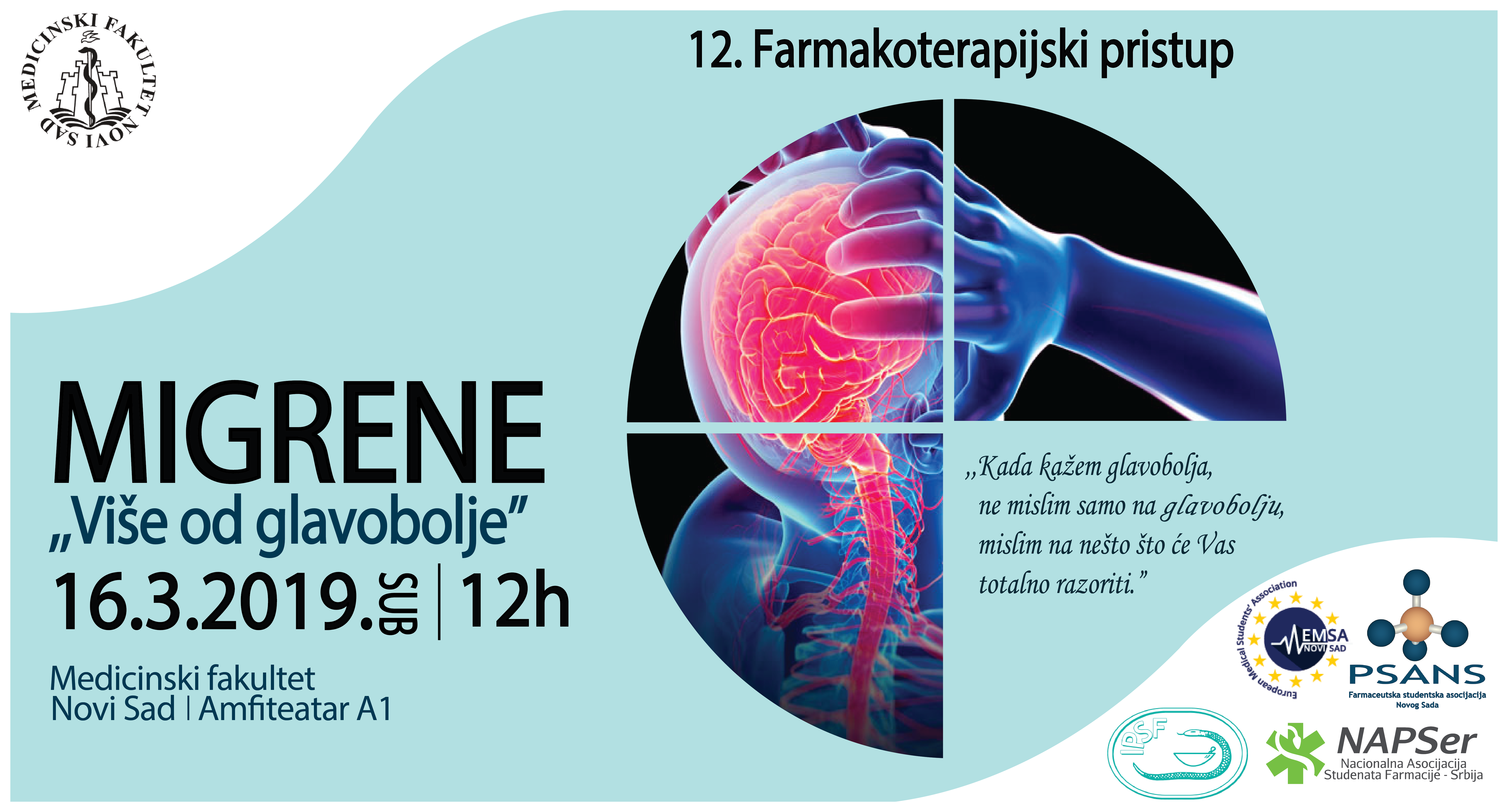 Farmaceutska studentska asocijacija Novog Sada - PSANS (Pharmacetuical Students’ Association of Novi Sad), će 16. marta u 12 časova u amfiteatru A1 Medicinskog fakulteta u Novom Sadu organizovati 12. Farmakoterapijski pristup pod nazivom „Migrene – Više od glavobolje“, u saradnji sa Evropskom asocijacijom studenata medicine – EMSA sa Medicinskog fakulteta u Novom Sadu.