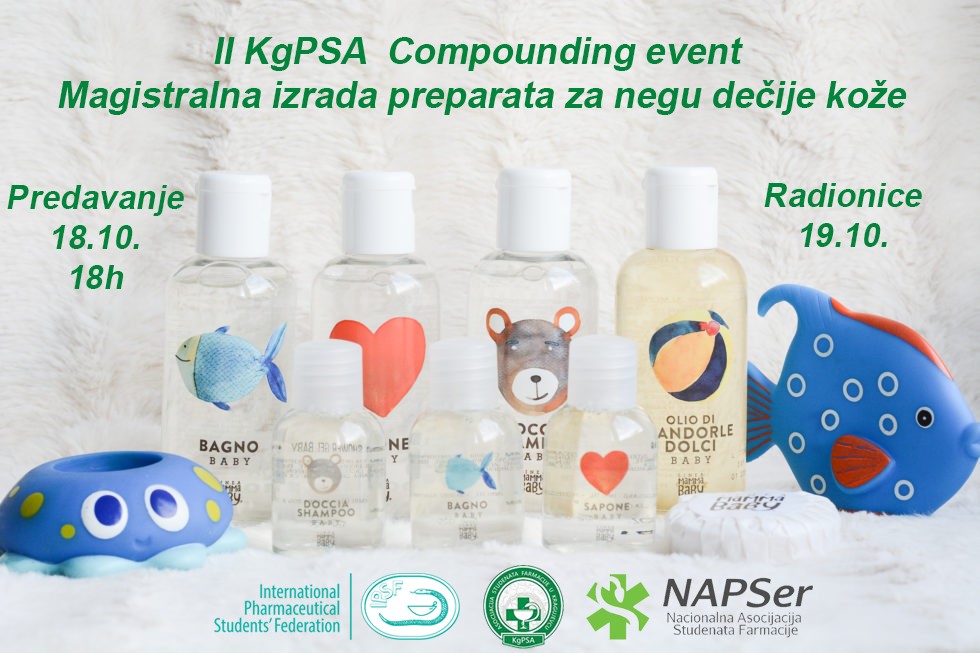Pozivamo vas na jos jedan KgPSA Compounding event sa temom "Magistralna izrada preparata za negu dečije kože". Predavanje će se održati u Farmakološkoj sali Fakulteta medicinskih nauka u Kragujevcu 18.10.2019. sa početkom od 18h. Studentima će se obratiti prof. dr Vesna Milačić sa katedre za dermatologiju, zatim doc. dr Ksenija Vučićević sa katedre za farmaceutsku tehnologiju, i mr ph spec. Milica Filipović, farmaceut iz prakse. Radionice će biti održane 19.10. (subota) u vežbaonici za farmaciju V18. Dođite da zajedno naučimo nešto više o pravilnoj nezi dečije kože i preparatima koji se u te svrhe koriste.