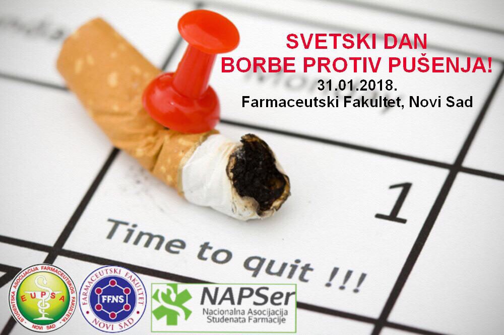 Akcija povodom Nacionalnog dana borbe protiv duvanskog dima EUPSA održava 31.01. na fakultetu. U periodu od 10h do 12h. Ideja akcije je da uputimo kolege, asistente i profesore o štetosti duvanskog dima. Delićemo flajere, vršićemo zamenu cigarete za voćku ili slatkiš, a pored toga ćemo prisustvovati predavanjima i pokazivati slike i snimke koji prikazuju kakav uticaj ima duvanski dim na zdravlje i izgled aktivnih i pasivnih pušača. Nadam se da ćemo uspeti da podignemo svest o tome koliko štetne efekte ima duvanski dim, kako na same pušače, tako i na njihovo okruženje.