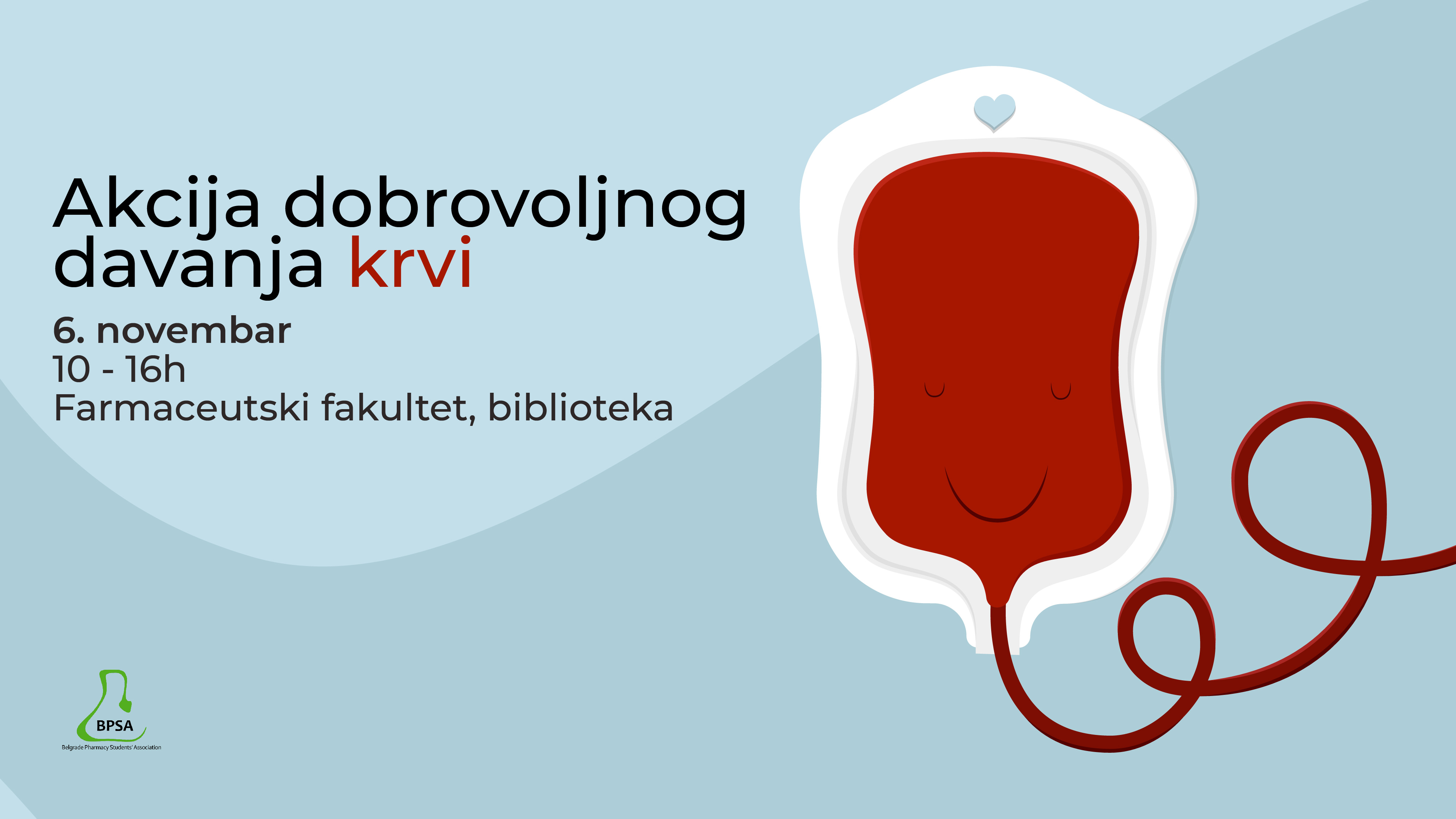Dobrovoljno davanje krvi, održaće se u utorak (6. novembar) od 10 do 16h, u čitaonici (biblioteci) Farmaceutskog fakulteta u Beogradu.